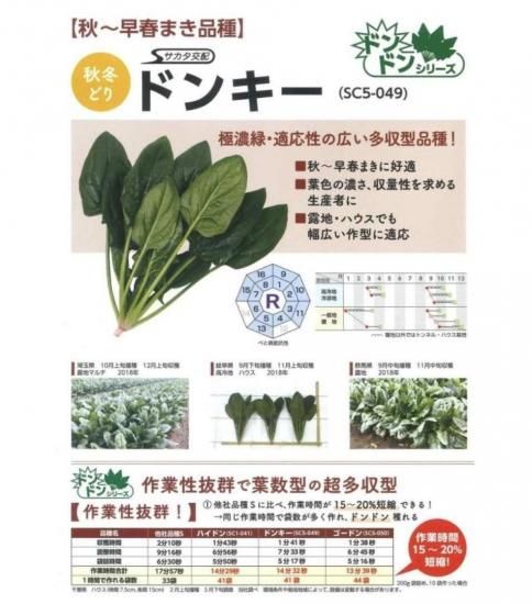 「ホウレンソウ ドンキー」は、濃緑色の葉・高収量性・在圃性(=収穫適期が広いこと)が特長の品種です。